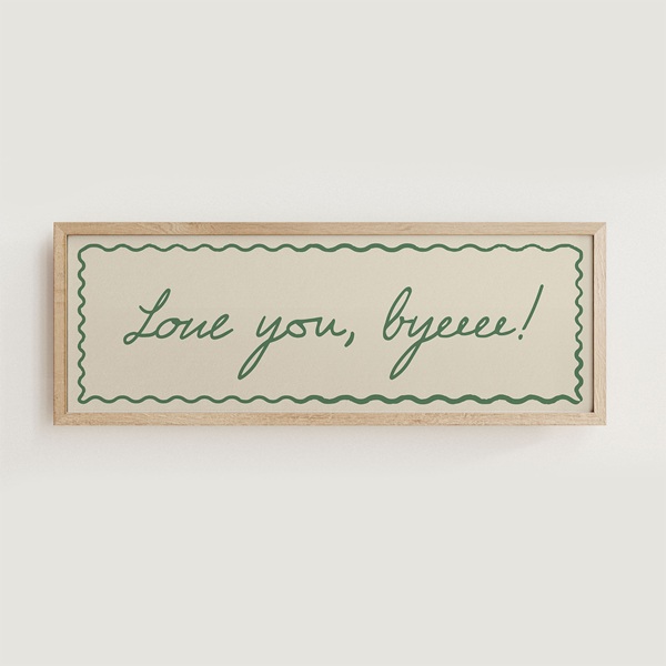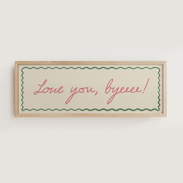 The phrase “Love You, Byeeee!” brings a playful, affectionate tone to your home. It feels warm, lighthearted and perfect for creating a friendly entrance or exit point. The print comes in multiple colour options and in a landscape format that suits hallways, stair landings and doorways.